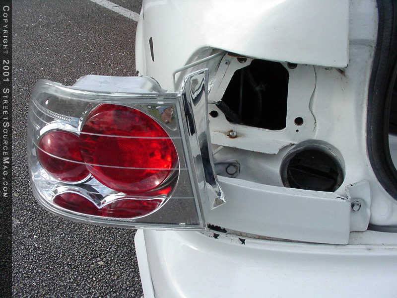 Next, the inner taillights were shaved, the tag box removed then relocated to the trunk, where the tag was frenched and canted into the one-off suicide trunk. The keyhole was frenched for added points as well. The gas door was also shaved and the filler neck moved behind the rear Altezza-style taillights, giving Nathan's Civic even more of a custom appeal.