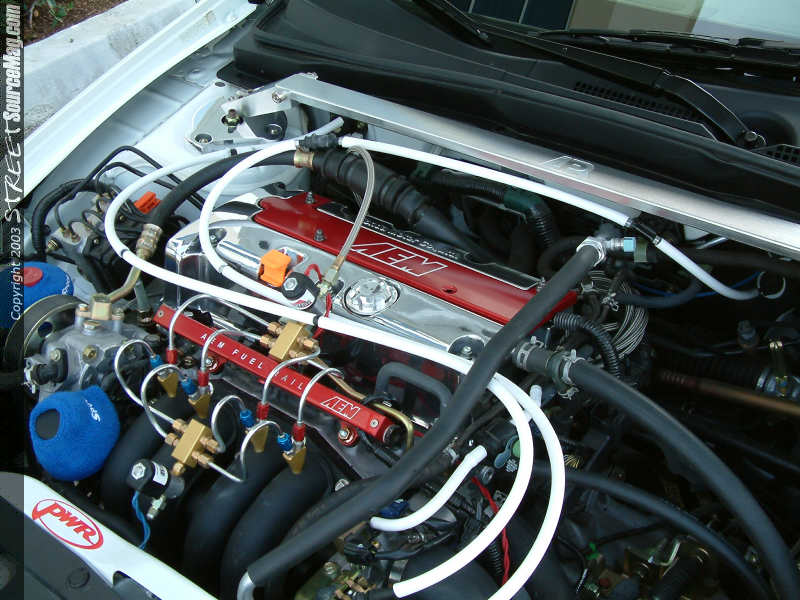 With the already quick 2.0L K20A implant it wouldn't take much to make things quicker and grab attention through not only the streets but at the show scene. For beginners Darron would install an AEM fuel rail, spark plug cover and a AEM cold air intake. Next a DC Sports 4 to 1 header would be bolted up to the block and the 2.25 Magnaflow stainless cat back system to help the engine breath a little easier.