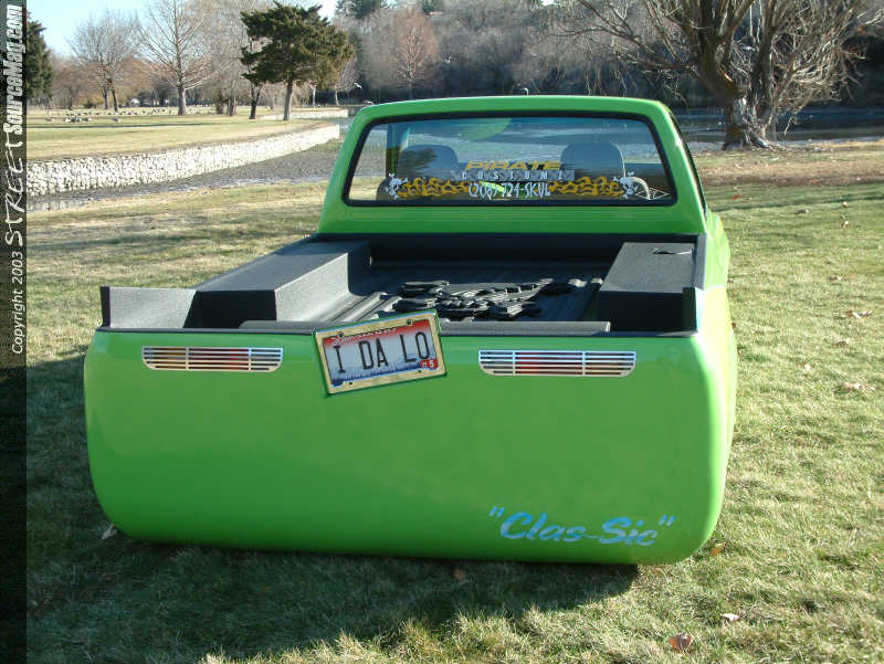 Next, Tony would weld up a Grant Fab tailgate skin housing a frenched in license plate box, once again keeping things smooth. The taillights were removed and replaced by a custom set fabricated by Bob Grant of Grant Fab. Tony from Pirate Customz would be responsible for the bodywork while Matt Stearns would show his block sanding skills.  With every thing ready for paint, it was time to let "Airbrush Chris" of Air Creations, Boise ID, show some skills of his own. The paint of choice for Tony would be a PPG Get'em green with Electric green 2 tone 50's style paint.