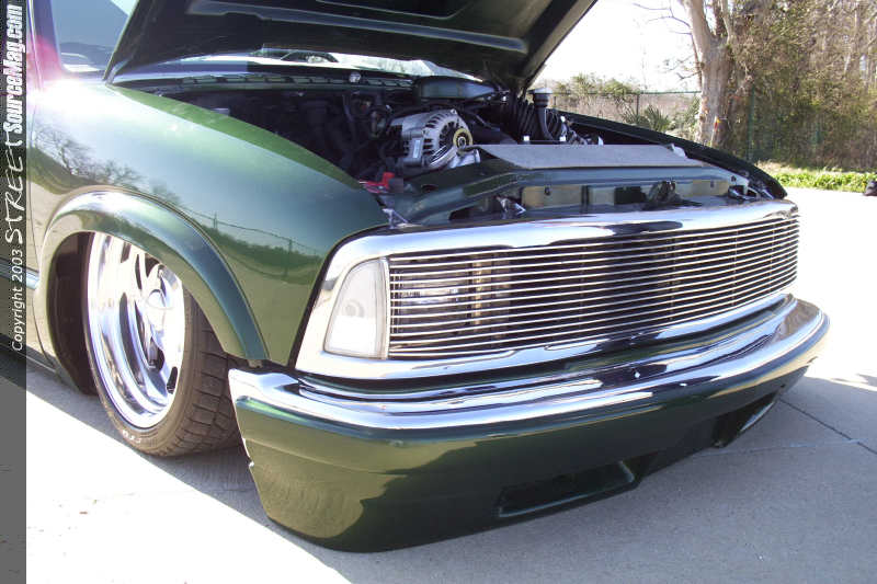 First the door handles, stock mirrors, tailgate handle, taillights and antenna would have to be history. Next the antenna would have be relocated and frenched into the passenger's side of the C pillar. Once all the bodywork was complete Ryan laid down several coats of factory Chevy Fairway Green paint and topped that off with generous amounts of the clear stuff.  With the paint shining it was then time to finish the exterior of the dime. Troy added a 97 Chevy S-10 chrome grill shell with a phantom billet grill hiding the HID conversion headlights neatly behind it.