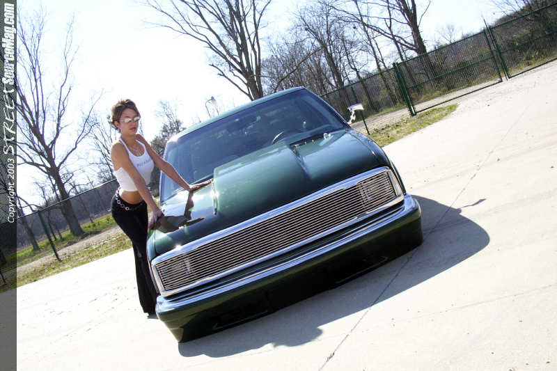 Next Damion swapped the roll pan that was previously installed for a Sophie roll pan with a clear taillight combo. To finish off the bed area Damion wrapped the bed area in a custom carpet kit. To make a few more ponies out of the 4.3 V6 a Ractive air intake system was installed and a Power Programmer was used to reprogram the computer to add the go fast appeal of the dime. To get rid of spent gasses a two chamber Flow-Master was then installed. To finish off the engine area assorted billet accessories were then installed under the hood. Now Damion had the show winning combination he wanted to achieve. Damion has shown his dime at such shows at New Orleans World of Wheels, Showfest, Lake Front Tour, Mardi Gras Nationals and several local events, taking home trophies at each to prove that this is not just another S-10. You can expect to see more of this ultra clean dime this next show season all over the south. There is no way Damion could forget to thank his wife Heidi who has put up with his costly obsession and past projects. Damion would also like to thank his club Envious Styles for all their support and hard work to make this truck happen. At a price tag of over 20g's to build this truck will make anyone Green with Envy.
