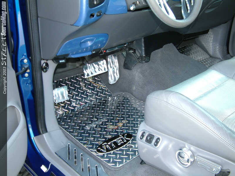 A set of NU-Image platinum gauges would replace the stock set while a Trenz flamed rearview mirror and flamed pedals would also be mounted up. Silver carbon fiber insert material can be found through out, along with the seats, which are found in stock leather but with custom center silver carbon fiber material in the centers. Finishing things off with a nice touch would be a set of Vitek diamond plate floor mats.