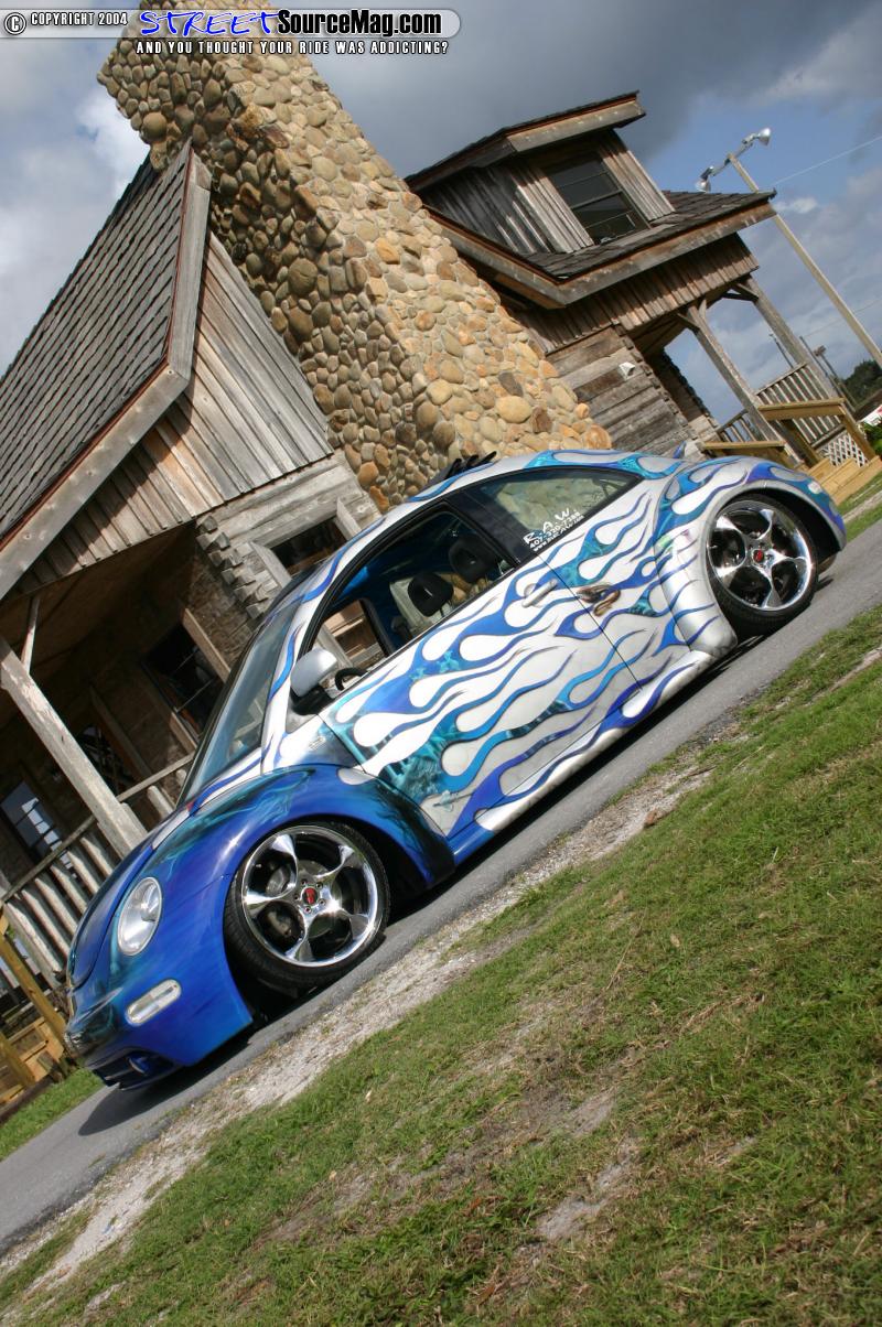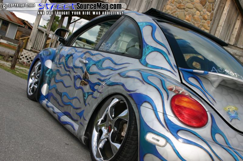 The main basecoat would be Silver with a fish scale overlay and topped with a rainbow pearl. To help set it off the crew from R.A.W. would then throw on top a set of blue flames with a teal pearl and a airbrushed theme through out the vehicle and accompanied by various characters such as "where's Waldo", the bud lizards, turtle love and much more found in every nook and cranny.