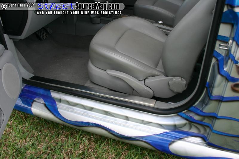 To bring the interior and exterior together with the custom paint and graphics going in through the door jams, Selena would have some fiberglassing work done to some interior panels and the same paint scheme applied within along with a new water feel. The dash piece found over the white faced gauges along with custom door panel pieces would be painted with the same fish scale idea and blue flames followed through to the back-side panels.
