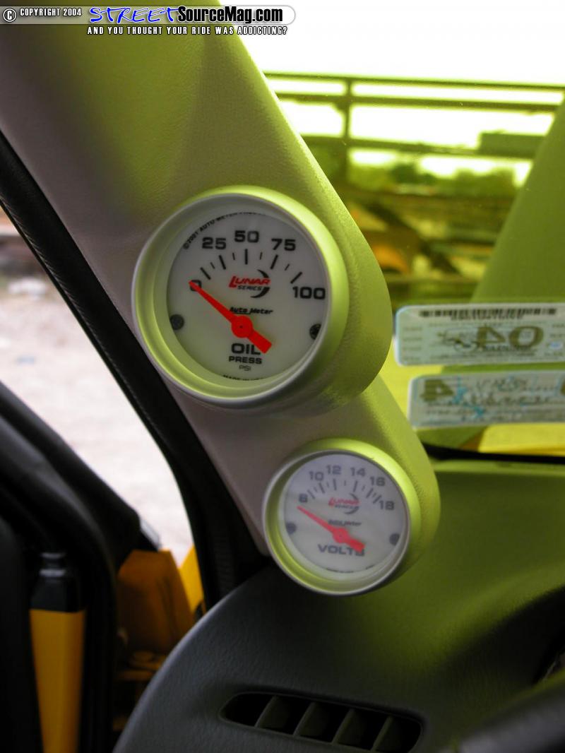 Next Victor turned his wicked grin towards the interior and continued laughing like a mad man. A complete set of Autometer Lunar gauges including a 5" tach with a carbon fiber cup, chrome extinguisher, boost, a/f ratio, exhaust gas temperature, voltage, oil pressure, and NOS pressure were established to monitor the heartbeat of this Protege.