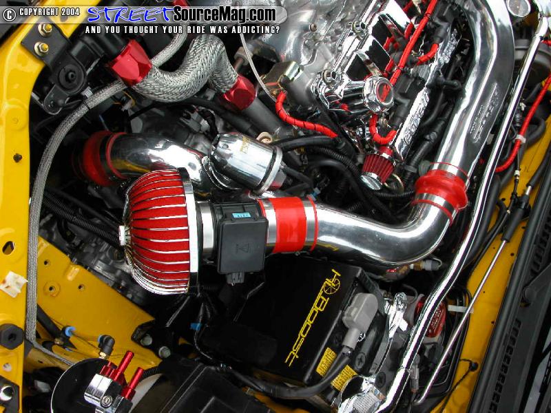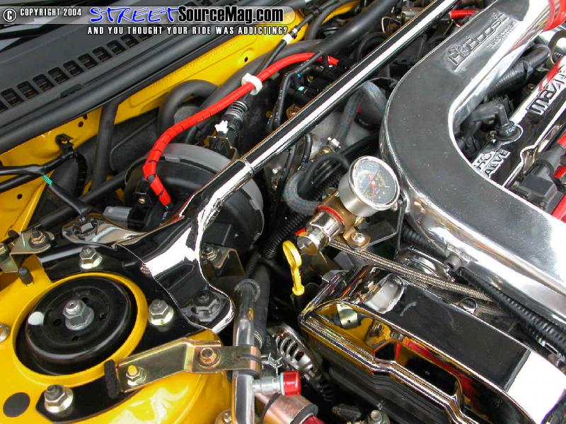 Trick it all up with polished intake pipes, a custom HiBoost turbo manifold polished and ceramic coated by Performance Coatings in Arlington, Texas, steel braided hoses, and an Apex-1 N1 exhaust system. Oh yea, then there's the chrome coolant catch can, the Injen aluminum oil cap, the Top Speed air filter, the MazdaSpeed JDM radiator cap, the chrome strut bar, and the Nokya red engine dress up kit.