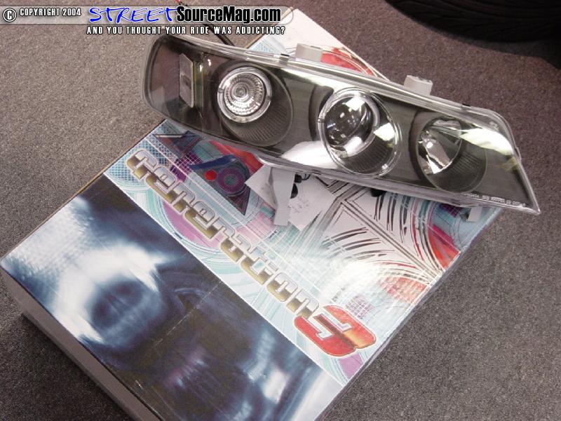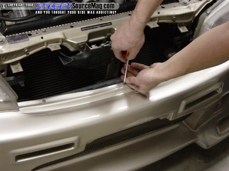 Next remove the Phillips head on top of each of the corner lights and pull it forward to release the pressure clips on the back of the lights. Now remove the Phillips head screws that are between the headlights. (This is where the stock bumper will vary from these pics. This car had 3 screws holding the center on.)