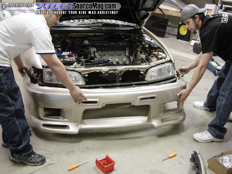 For the next step you might need to turn the wheel into the wheel well of the side you are working on. This will give you a little more room to work. If you still have the stock bumper, you will need to remove a couple clips holding the plastic inner fender in. After this, there will be a Phillips head screw holding the end of each side of the bumper. Now here's where you will need that extra set of hands. Gently pull the front bumper forward and completely remove it from the car. Be careful not to lay it down on its face to avoid scratches. There will be two 10mm bolts on top of each headlight that will need to be removed.