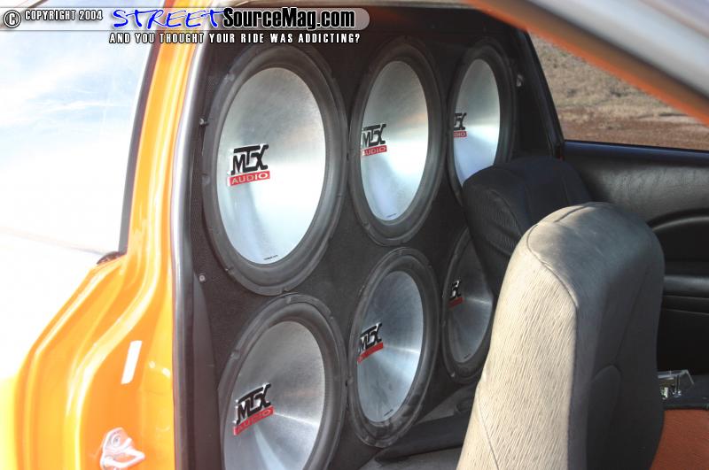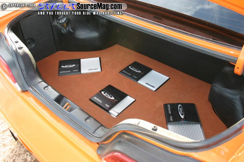 The center console flows from the front seat into the back where it meets the wall mount sub enclosure. Phil’s wall mount houses 6 15” MTX subs. 3 Class D Boss amps power all these. Boss mids and tweeters provide the vocals.