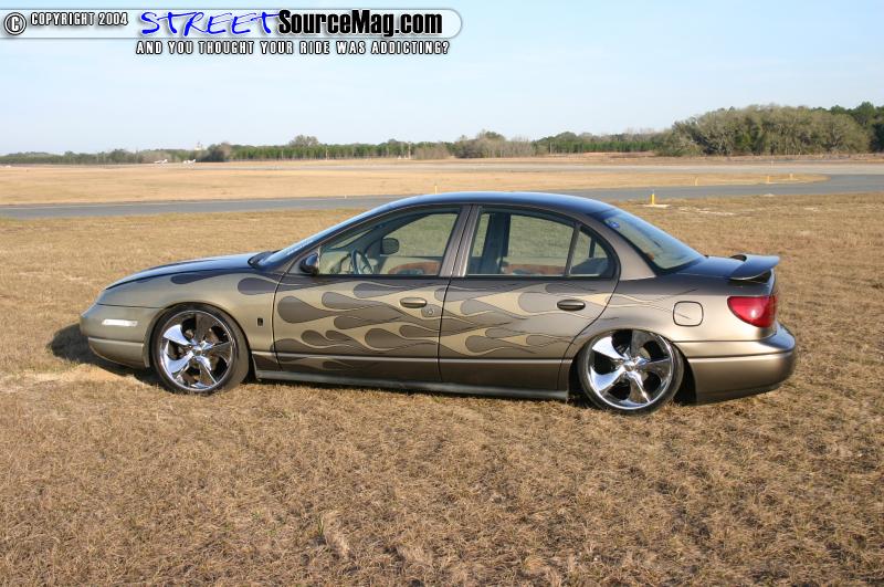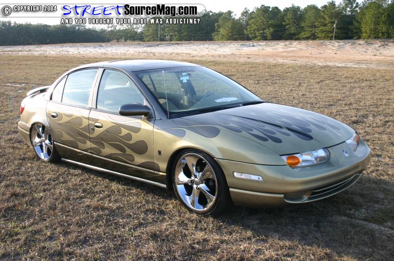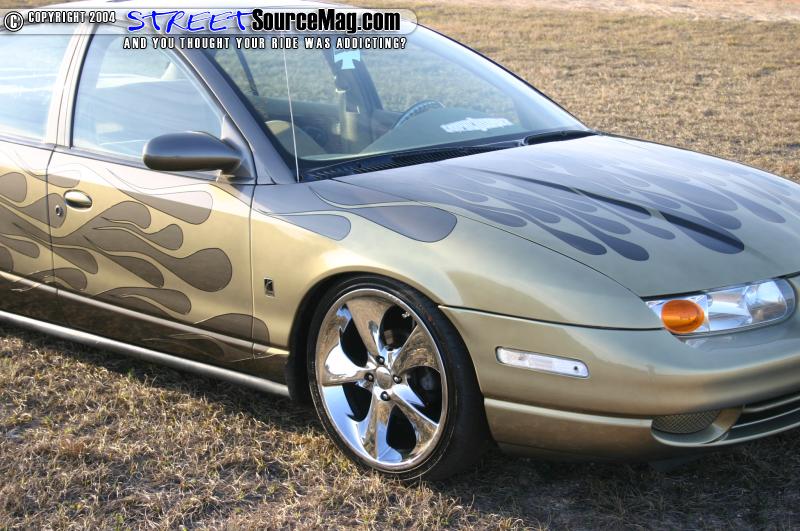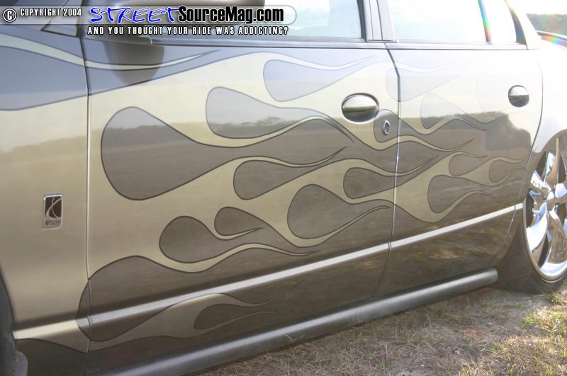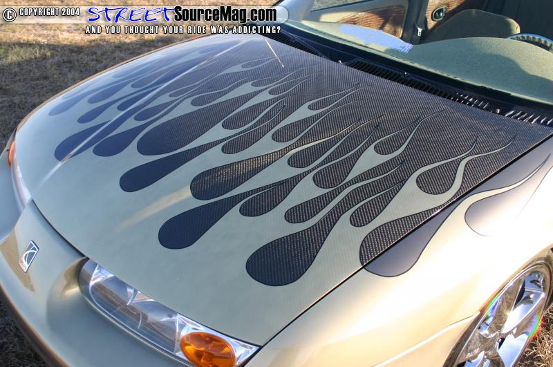 The carbon fiber hood would also be given a paint treatment. Cody went a step further and had the mirrors, and pillars painted to match the car. Next, Gold Pearl flames would be laid over the car to make it stand out. Black pin stripping finished off the paint.