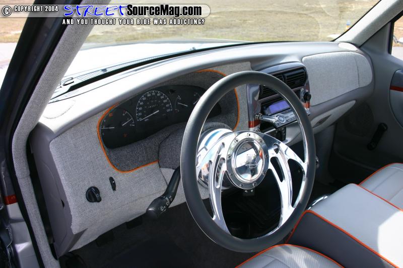 The seats were custom fabricated by Ken. What he did was create a custom low back seat with the top half being Escort seats, and the bottom half being Ranger seats. The seats where then wrapped by Larry’s Trim in carbon fiber silver, gator shine leather, gray vinyl, and finished off with orange piping. The steering wheel was replaced with a Billet Specialties billet wheel, and the mirror was replaced with a billet-milled mirror. A Kenwood head unit, Rockford Fostgate subs, and Blaupunkt mids and tweets provide the sound. Audiobahn and Blaupunkt amps power the system.
