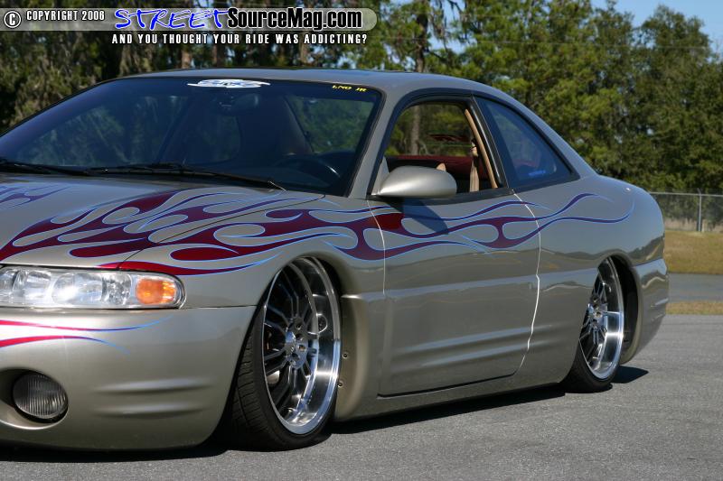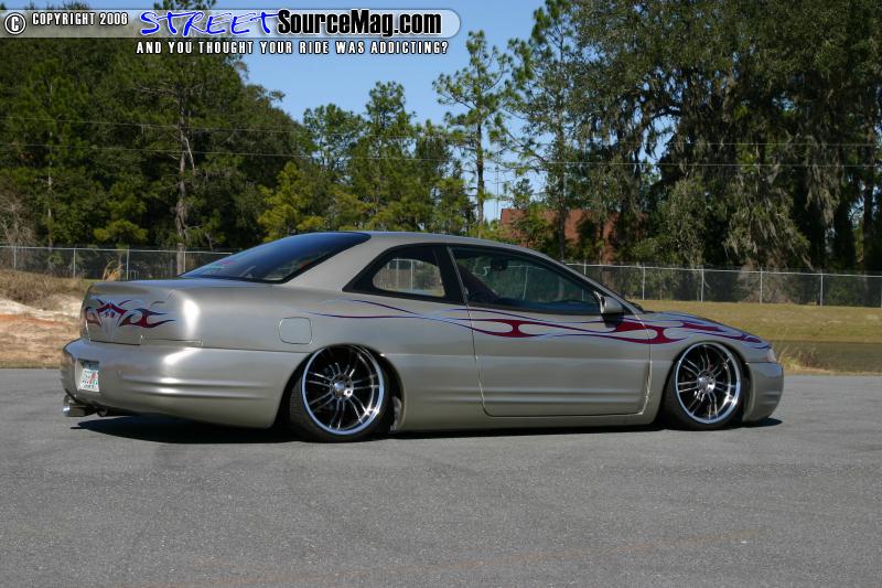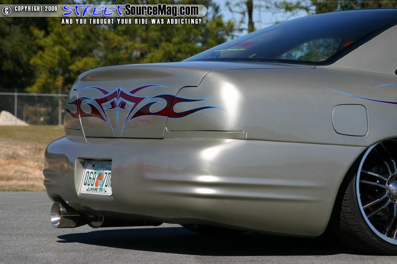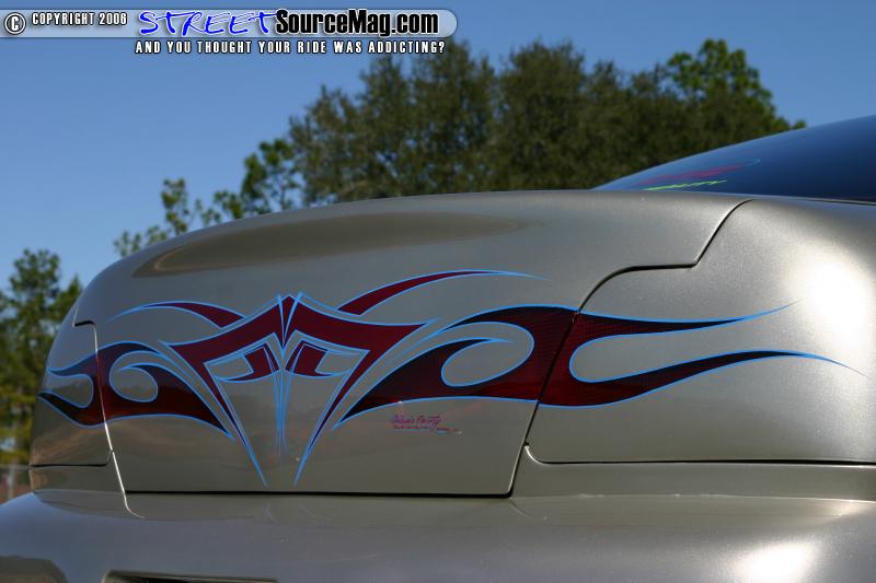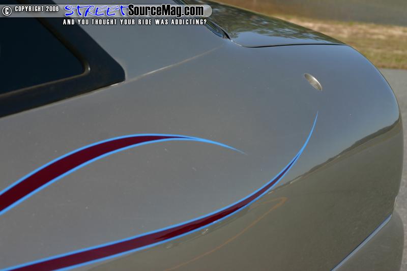 The antenna was replaced with a frenched antenna. The stock side skirts were then molded to the car to give them a custom appearance, the car was then rolled into the paint both and sprayed with a few coats of PPG Silver accented with HOK tribal burgundy flames. Todd Fisher completed the paint and clear stage then striped the tribal flames with Electric Blue oneshot paint.