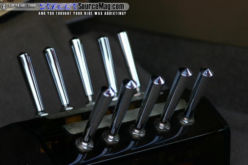 Fleet’s Sebring wouldn’t get very far at any show with its stock stance so a 2 pump Showtime hydro setup was installed with 4 accumulators, 10 switch’s, and 4 yellow top battery’s. All of the hydro lines were hard lined. To get the car to lay a little lower the front spindles were shortened, custom upper and lower control arms were built for the rear, and Toyota spindles were installed in the rear.