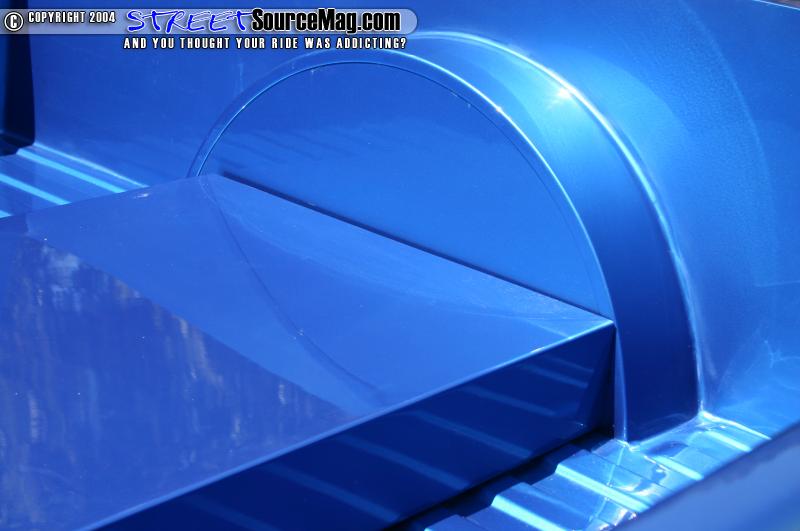 Next Justin and David Larson started the extensive bodywork around the truck by shaving the door handles, molding in an AIM role pan, shaving the tail lights and installing LED lights across either side of the rear, shaving the tailgate handle, and moving back to the front the antenna was shaved off for a cleaner look. The truck was also fitted with tubbed fenders up front and a bridge cover in the bed of the truck. All said and done the truck was looking pretty badass but Justin knew he was still not finished.