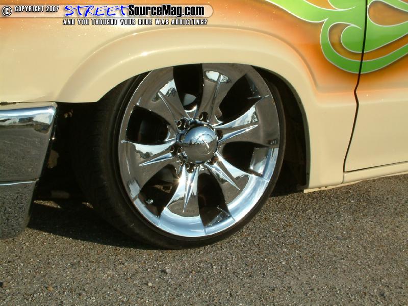 Getting things moving, Michael would monster notch the rear frame rails before mounting up the custom 4 link. Air bags would then be placed at all 4 corners along with Toxic shocks. With a mix of a 10 switch box, 1/2 valves, DC5000 compressors and two 3 gallon aluminum tanks, Michael would have adjust ability on the fly while rolling on is 18" Equis Tourq's.
