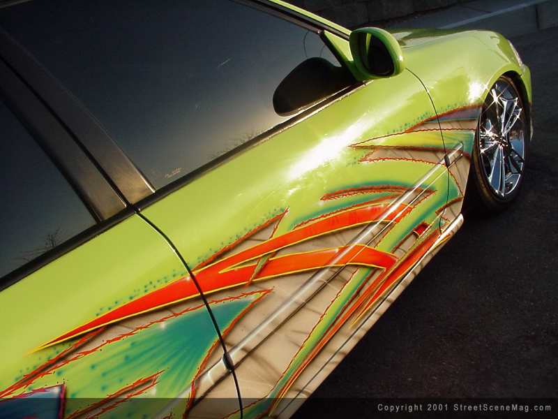To get the civic started, Tony decided that many stock items needed to accompany the trash. For beginners, Tony along with help from fellow club member, John Helzer, began by shaving many items. The first to go would be the four door handles. To accompany the handles in the trash, the emblems, squirters, inner taillights along with the license plate box would also be removed. With the new sheet metal in place, it was then left to Zach Fullmer to block sand the entire civic and prep it for paint. Now ready for paint, Tony turned to "Airbrush" Chris of Boise Idaho, for his graphics expertise. After laying down the base Parrot Green PPG paint, Airbrush then got busy applying the various mixtures of PPG colors.