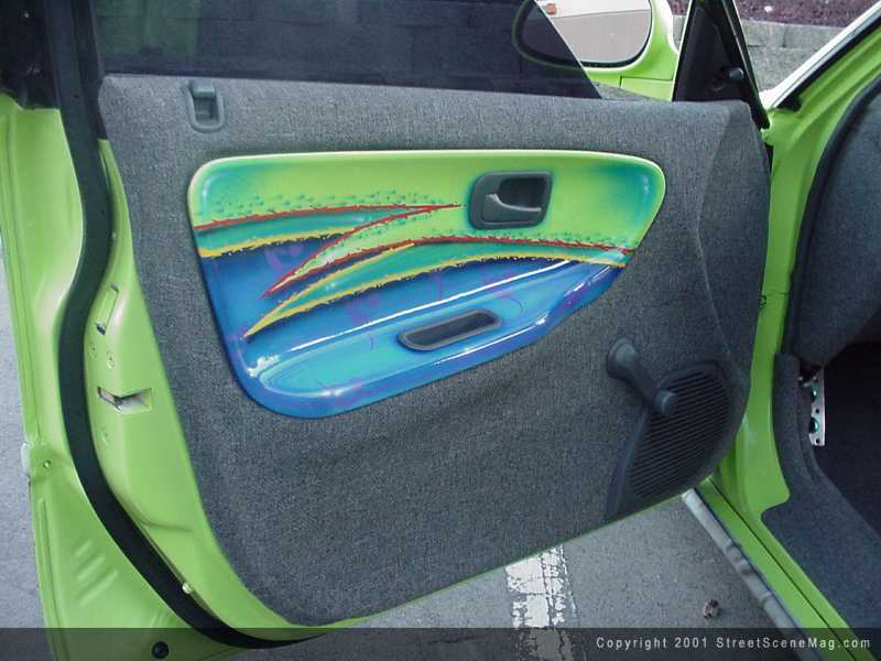 For starters, the dash of the civic would be tweeded along with the civic logo placed in the tweed just above the jockey box. Next, Tony tweed the entire door panels leaving the center inserts to be prepped and painted to match the exterior by "Airbrush" Chris.