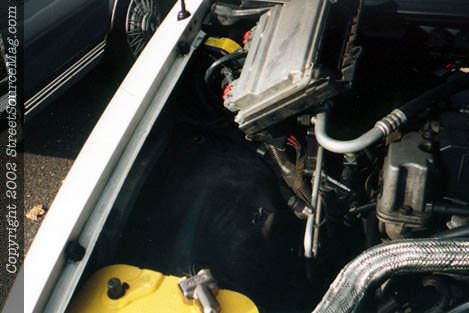 Step 3 Next, remove the three 10mm bolts holding the coolant tank to the inner fender, and pull off the hose running to the radiator, so you can completely remove the resevoir. Set it aside.