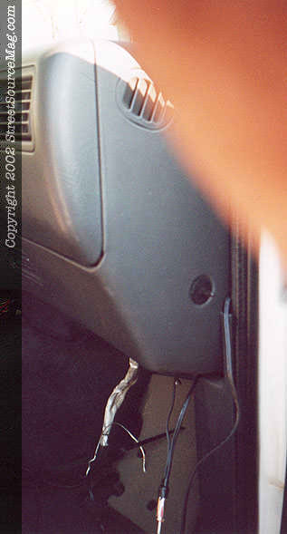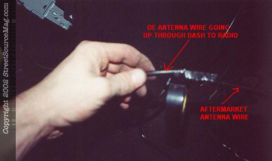 Step 18 Now I tried sticking my arm up the dash to run the new antenna wire, but there is just way too much crap in there. A much easier thing to do is to "fish" the wire up. This is accomplished by laying the old OE wire on top of the new antenna wire, and taping them securly together. Now pull the old wire up out of the dash, and while your doing that, the new wire comes with it. Wow! Aren't we glad we didn't pull it out earlier. And the new wire runs exactly the same way the old wire ran, so there should be no interference with anything. Step 19 Now that the new wire is where we want it to be, it needs to be connected. The new antenna wire has a positive lead that should be connected to a switched on source, because the hidden antenna has a built in amplifier. I connected it to the switched on source for the radio with a squeeze together "T" splice, and plugged the antenna into it's jack.