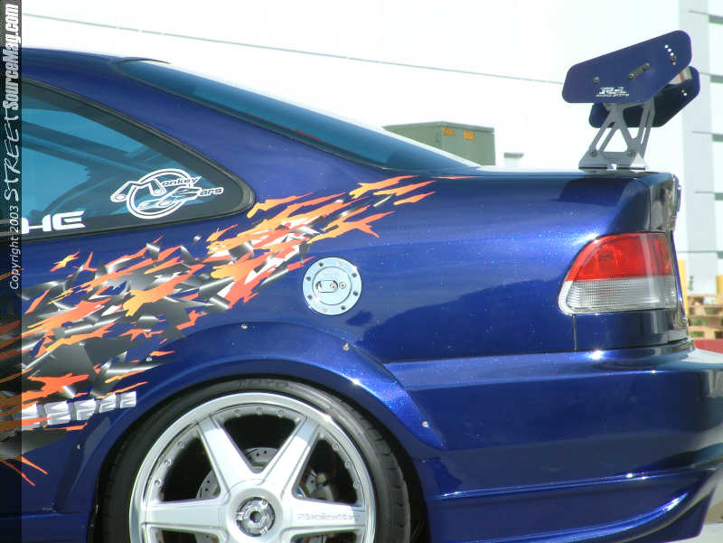 Once the car was striped of the masking tape and buffed to a high gloss, TG Graphics applied Bomex JDM Graphics to the car. To add to the exterior attire a Corvis Aluminum wing and APR Formula 3 carbon fiber mirrors were installed. To ensure proper lighting at night a set of Phillips HID conversions were installed.