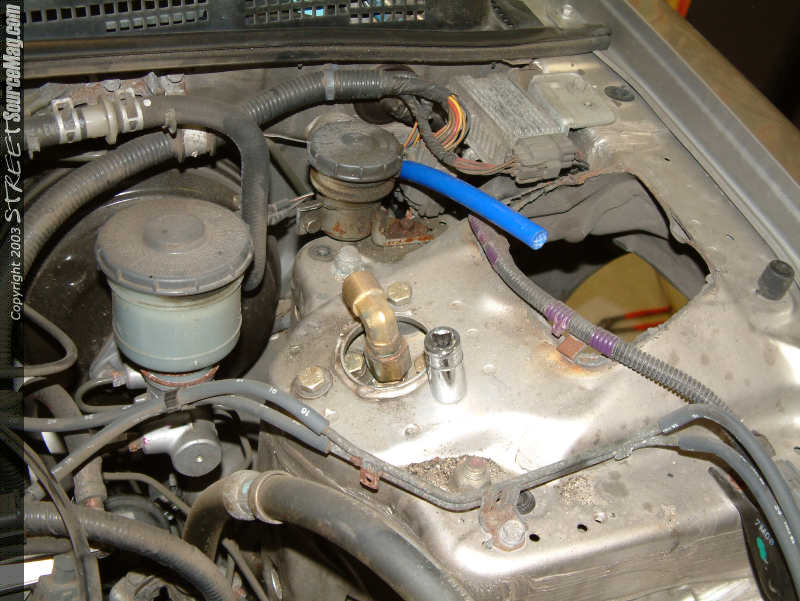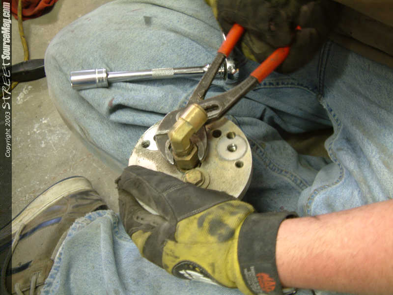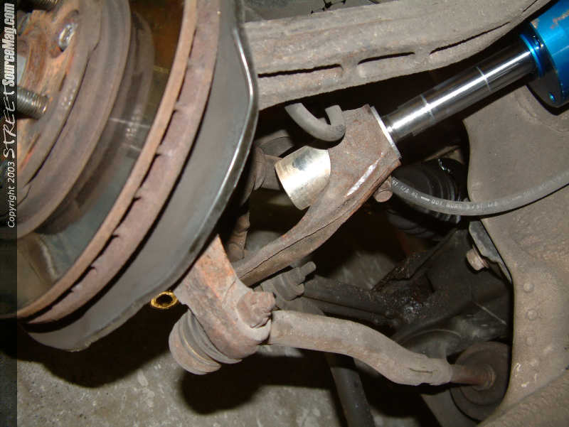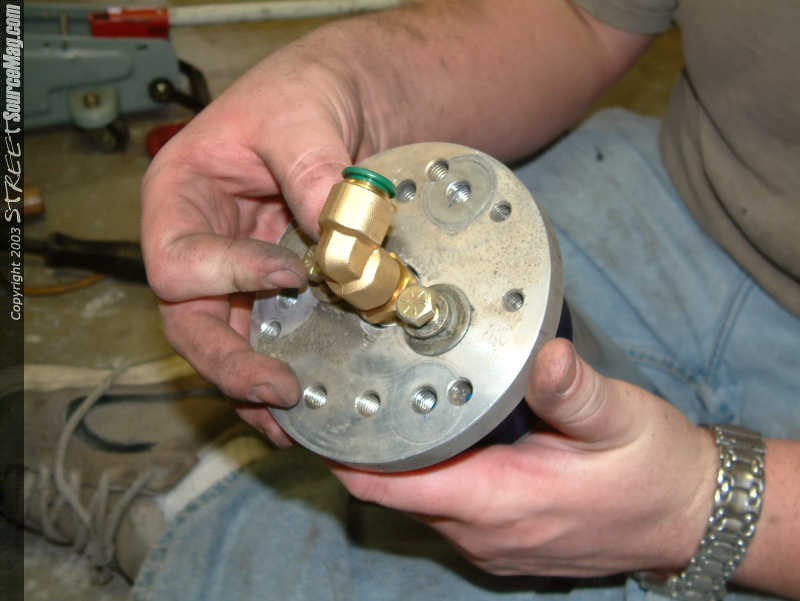 2. Since the front of the car is ready for its new suspension, it's time to assemble the new Parker air cylinders. First, install a small sir muffler to the bottom of the air cylinders. These will act as filters, keeping dirt and moisture out of the cylinder. (keeping these mufflers out is an option, and it will speed up the cylinders if you are looking for fast). The fork adapter simply screws onto the rod end of the cylinder. With the fork adapter in place, you will then bolt on the billet aluminum upper mounts (DO NOT OVER TIGHTEN BOLTS IN TO BILLET BRACKETS. IT MAY DAMAGE BRACKETS AND TOPS OF CYLINDERS.), and then attach the air fittings.