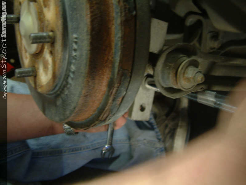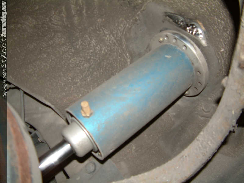 4. The rear suspension is just as easy. First remove the upper cylinder mounting hardware, as well as the lower bolt that secures the cylinder to the lower control arms. This is where you work your leg muscles. The easiest way by far to make room to remove the current cylinders, which is way easier then the factory struts, is to put some pressure on the lower control arms, which will swing them out of the way of the cylinder. Once the cylinder becomes dislodged, simply slide them out of the fender walls.