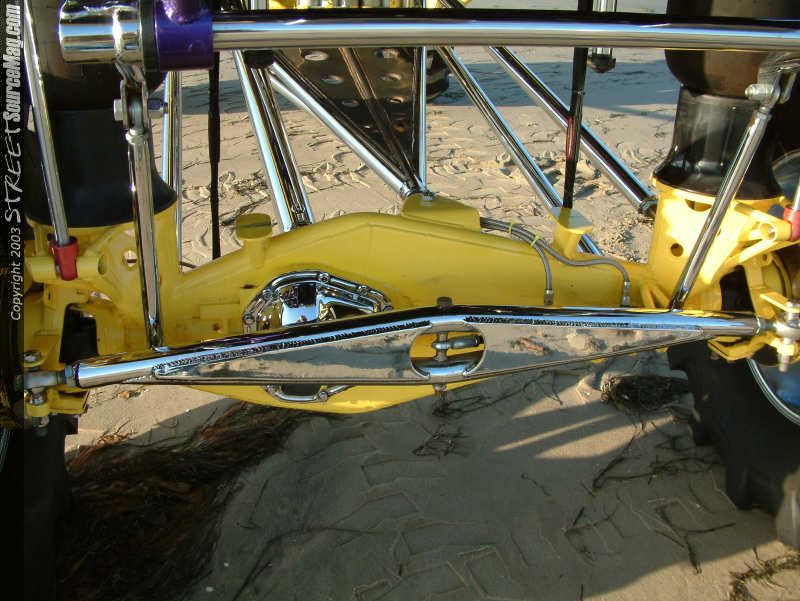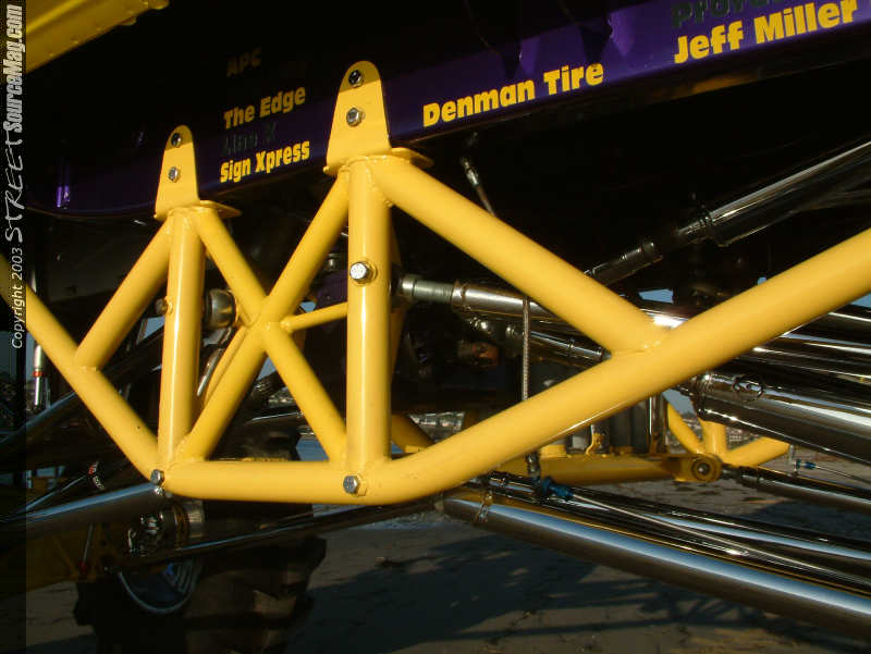 The cage also provides the mounting locations for the chrome-plated "The Edge" Donahoe Racing Enterprises link bars with 1-ΒΌ heim joints. The front is equipped with a triangulated four-link and the rear is fitted with a triangulated two-link system. There was even enough room left over for the 4 Optima yellow top batteries to straddle the transfer case.