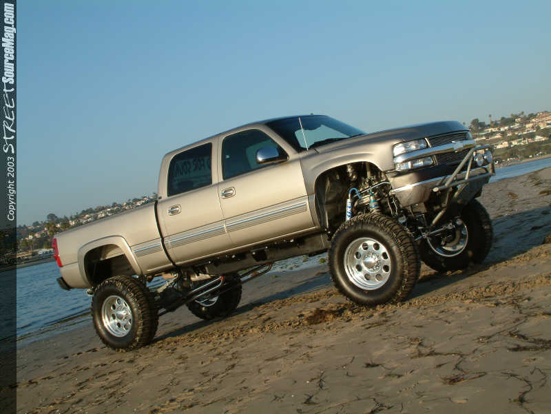 With purchasing his all new Chevy 2599 HD for $32,000 back on April 11th of 2001 along with dishing out another $50,000 into the build up, it would take 1 year to build and would be found complete on June 15th of 2002. The reason Adam decided to build this ride was as a shop vehicle showing off their skills. Adam has previously built an 85 Blazer and a '84 1500 but felt that this would be his pride. After became involved in the scene when he opened up his shop 12 years ago, the skills are found better as the years go on. Adam's decision to keep things simple would pay off. Starting upfront a Billet Stoll grille would be installed along with Pewter painted brush guard and chromed out cover. In the guard you will find a set of lights mounted up for those late night 4x4 adventures. Next the stock front fenders would be thrown to the side and a set of Glass Works Fiber fenders, with a Pre-runner look would be bolted in their place. The stock door handles would then be removed and a set off of an Escalade would be found bolted in along with a set of 2003 Chevy taillights in the rear.  | Everything with this truck is very clean, not even a spot of dirt in the wheel wells! |