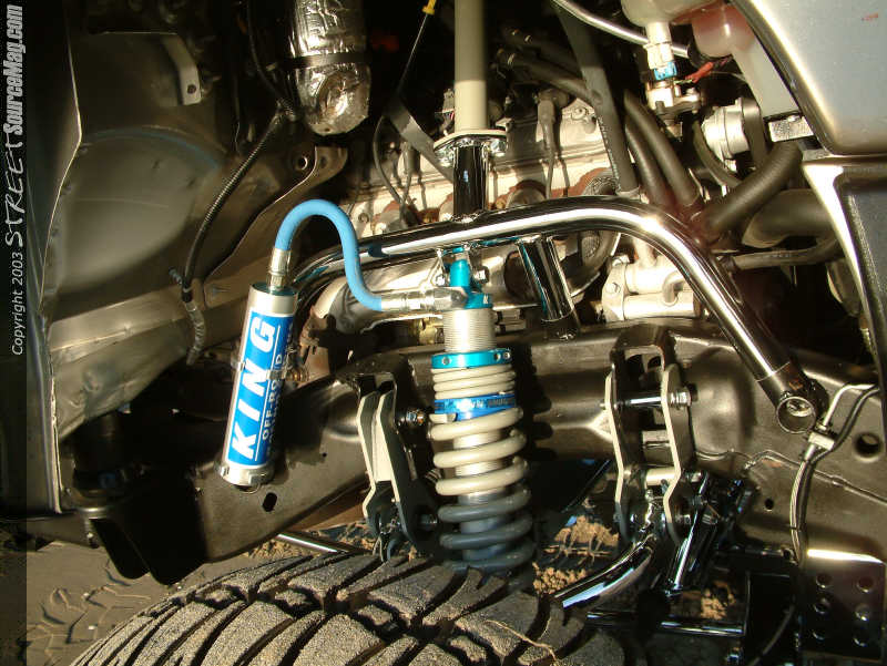 After the build up complete, the bars would be chrome plated along with much of the suspension items. To help the suspension and rough road riding, a set of King coilovers would be installed front and rear. With a 3-inch body lift, there was no problem clearing the fenders with the 20-inch KMC wheels, which have been wrapped in 40 inch TRXUS SuperSwampers.