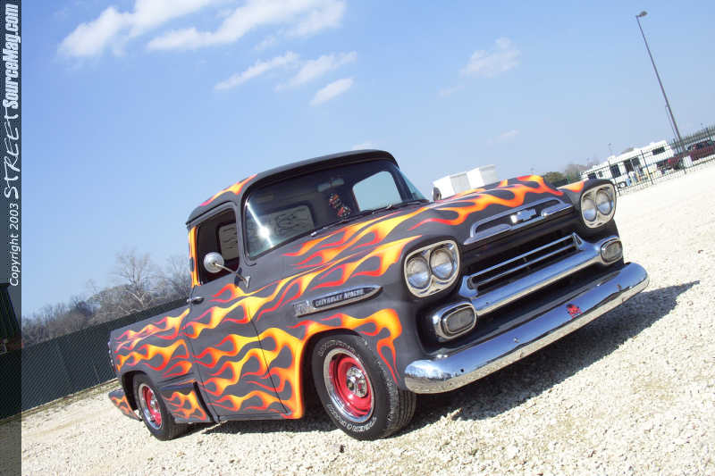 Billy started the project by finding the cab and front clip of a completely wore out 59' Apache. Ok so I know your asking why only the cab and clip. Well if you'll hold your horses I'll tell yeah. See Billy only needed the cab and front clip because that was all he planned to use of it. Billy took the frame, motor, suspension, bed and part of the interior of a 1988 Chevy ½ ton donor truck to use in a perfect mix with the 59's cab and front clip. Billy took the 59' cab and placed it on the 88' frame reworking the cab mounts to accept the Apache cab. Once the cab was firmly set on its new foundation it was then time to move attentions to the rear of the truck. Billy once again pulled out all the stops and added an 88' Chevy step-side bed, but to make sure that the bed fit correctly it was turned over to the fiberglass skills of Tim Dupre of Houma, La. Tim cut, sectioned, shaped and reworked the bed until it fit perfectly behind the 59' cab. While Tim had his tools out he shaved the tailgate handle and molded in a new rollpan. Once the bed was permantly in place a set of 88' Altezza Euro clear taillights were then temporarily installed in the factory location to give it a new flair. To add style to the cab Tim shaved the vent glasses of the cab to loose the Farmer Brown look. Once the body was straight Billy knew it would be awhile before he was ready to lay down the final paint scheme so Billy asked Tim to prime the truck flat black.