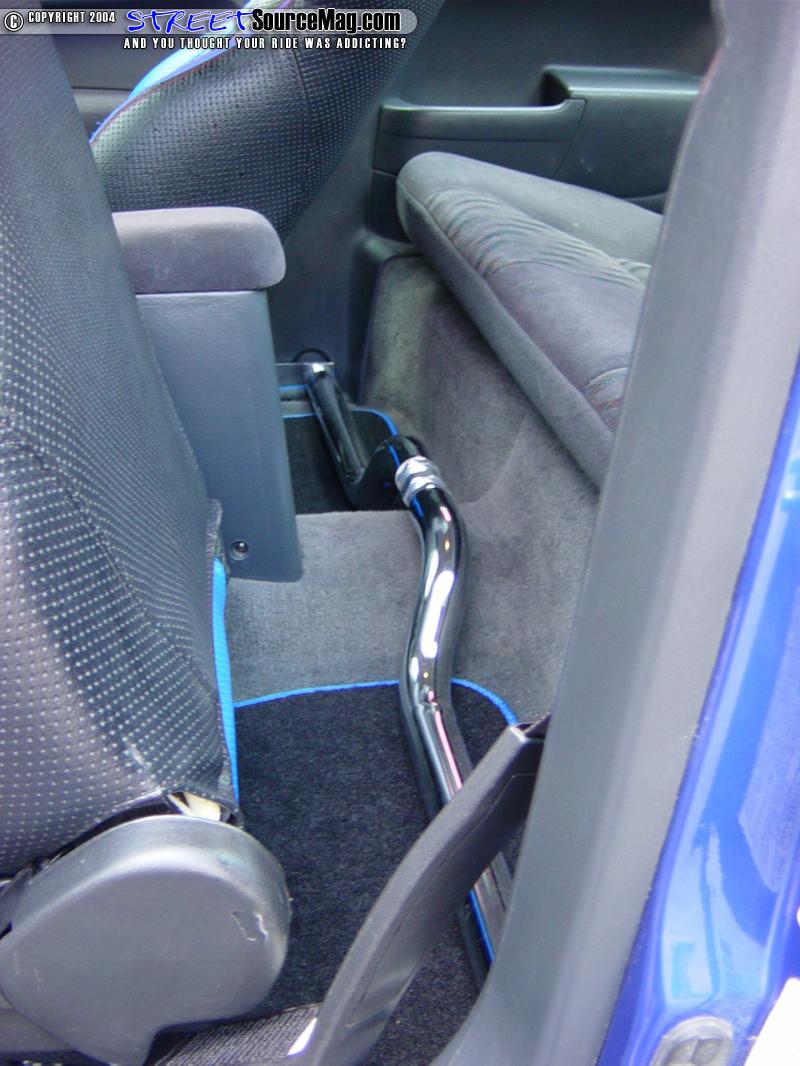 The list of gauges is as follows; tach, air/fuel ratio, water temperature, oil pressure, boost and vacuum. He also put in reverse indiglo gauge faces on the stock gauges to match all the auxiliary ones he added.  To help stiffen the mid section of the car, an Aerospeed lower rear interior brace was added across the rear floorboard.