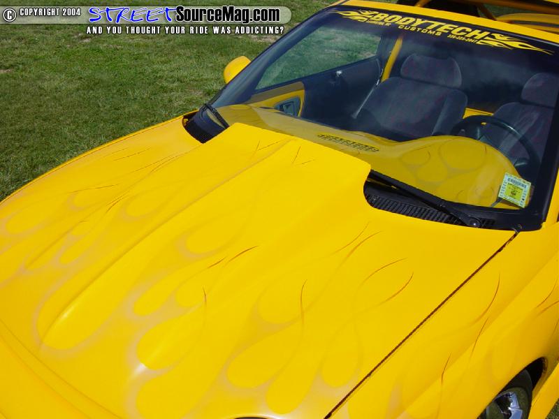 With an exterior like that, it was necessary to have an interior that wouldn't look out of place. Brandon pulled out the dash, center console and tops of the door panels and sanded them down smooth and sprayed the same yellow with gold pearl paint as the exterior.  He also had matching ghost flames sprayed on the top of the dash. Now for what makes this interior stand out is the full frame-to-frame roll bar.