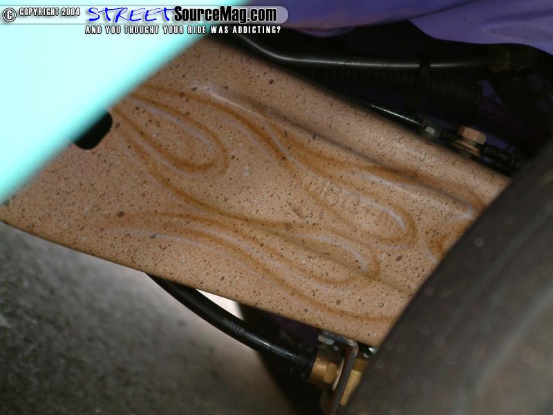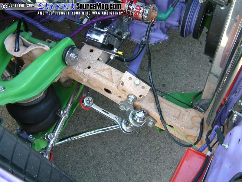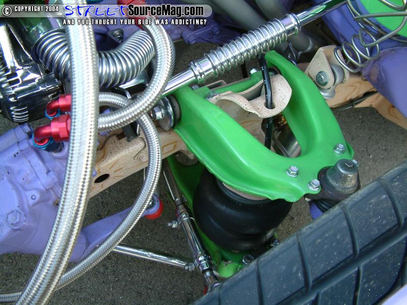 The air system is kept with air via two 450c Viar compressors. Many of the chassis components were then powder coated by Chuck at Performance Coatings of Oklahoma City while all other items where chrome plated by Ramos Coatings. The frame is also found to have many hieroglyphics to match the over all theme of the build up.