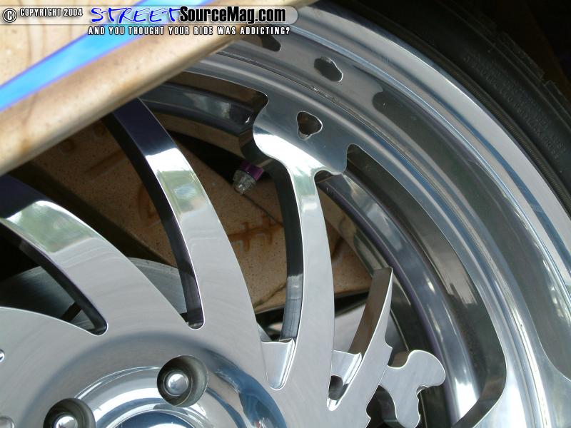 The battery would also need to be moved under the bed and in the place of the stock battery Charles would install 2 Stinger batteries. With the new drop many items would be moved and reworked to fit the new 18-inch B.A.D. Bone yard billet wheels wrapped in Nitto tires while the rear would be tubbed to fit the 20x8-1/2 wrapped in 255-35 Nitto tires.   Behind the wheels you will also find a custom slotted disk brake kit from Downey Off-Road and the fluid finds its way via the newfound stainless brake lines.