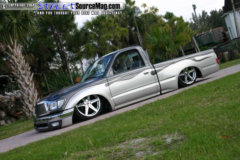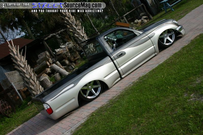 For ups, Firestone 2500 bags would be installed at all 4 corners. Not yet low enough for Tony's taste, Shaune would then need to move the master cylinder up a bit and relocate the battery into the bed for the 4-inch body drop. The firewall would then be tubbed to allow more room for the 19's. After layin' rocker this beast still has A/C, which is a necessity for every day driving in Florida. Finishing the bed set up and suspension, a molded notch cover with RAW logo would be added and sprayed over by a Linex spray-on system.