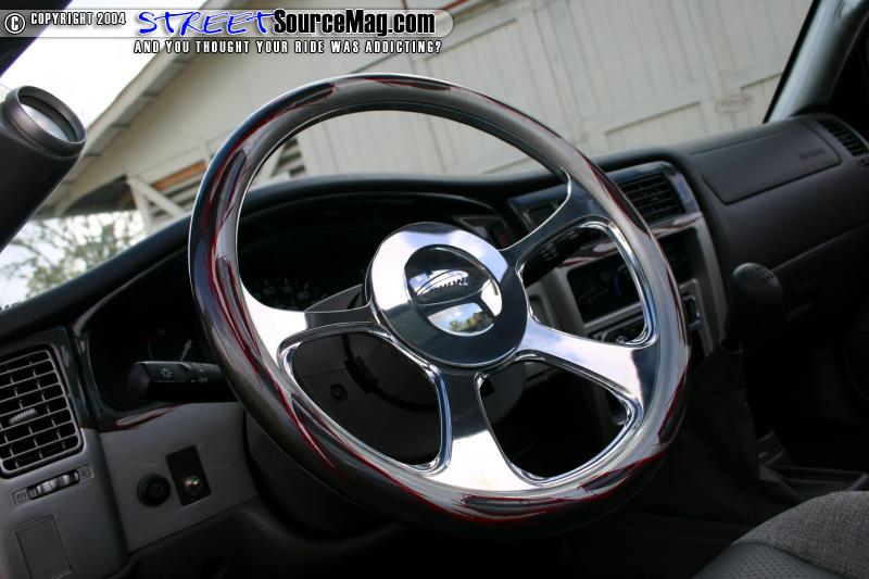 A RAW one piece molded gauge pod housing a set of Autometer air gauges is found in the driver pillar. For tunes on those long daily drives, a Kenwood MP-522 MP3 player installed into the dash. The interior paint would be handled by RAW and the wrapping done by Tony. Keeping the engine clean and simple, Tony would change up the alternator and have it boosted to 120 amps to handle the stereo and battery charged needs for the suspension. A polished intake is then found installed for that clean look and added performance. Thanks goes out to his boy Shaune Lewis who handled the fab work on the truck, Corey who started the body work and Anthony Rhodes who finished the paint and bodywork, Troy for stressin', mom for stayin' up late the week before Blooddrag for the seats, Kenny for makin us laugh and to ME (Garrick) for tryin to keep him laughin all weekend knowing what he was dealing with. And last but not least to all his club members of Relaxed Atmosphere!