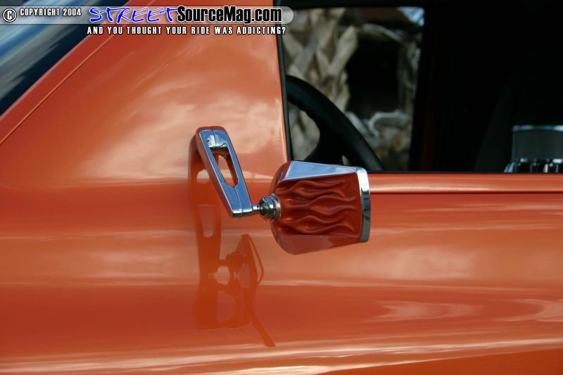 Taking on the sides, the emblems, door handles and antenna would all be shaved while the gas filler door was relocated into the bed. The taillights would be junked and a set of 2004 Dodge Ram tails would be fitted in their place. The mirrors would be shaved and replaced with a flamed chopper style mirror to help finish off the side work.