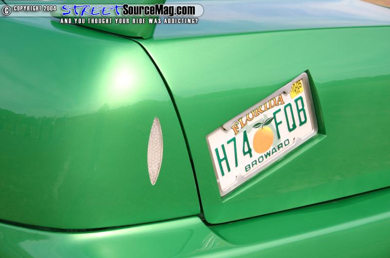 Along with the shaving Rob decided to do away with the antenna, and license plate and to french the license plate. Next a set of Lamborghini style hinges where installed, as well as a flip-flop trunk kit, and clamshell hood. Next Mad Mods would lay down the Electric Lime green custom paint, and then set it off with custom tribal and airbrush work. With all that work done to the body, Rob was now ready to send his car in for some stitching.