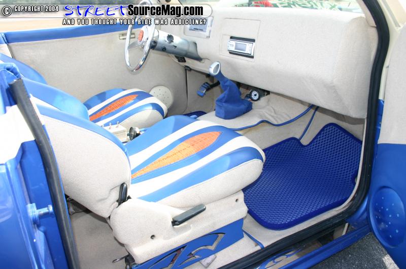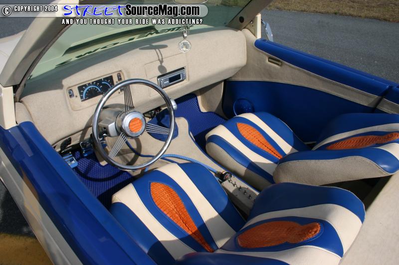 The seats where covered in blue and cream tweed, vinyl and gator skin inserts. A Grant Banjo steering wheel was bolted up. Tito gets his sound and video from a JVC touch screen headunit, the bump and vocals are provided by Phoenix gold 4ooWatt and Alpine V-12 2ooWatt amps, Boston Acoustic mids/tweets, and 12” Infinity subs.