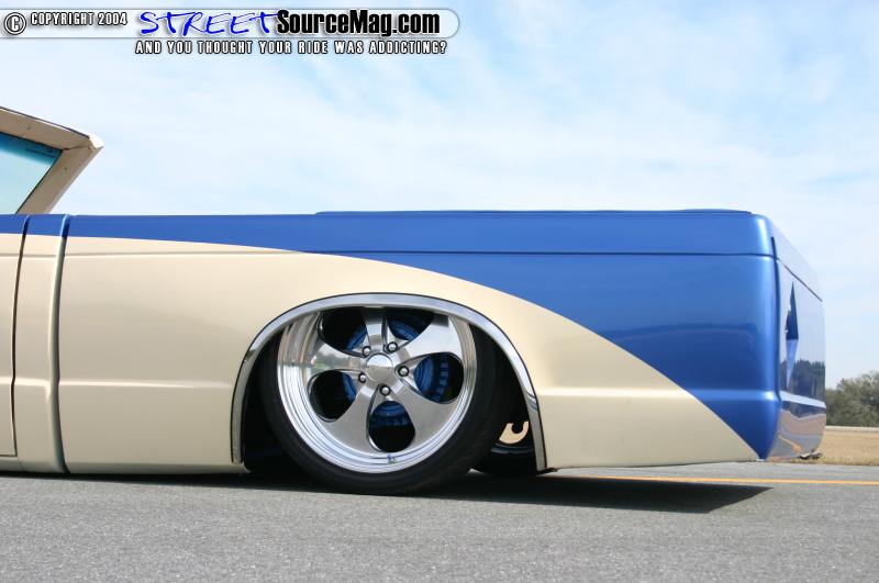 The up’s and down’s of Tito’s S-10 are provided by a fast bag air ride setup. AON Customs built the 2x4” square frame. The setup has a 36” ladder bar setup. Tito also opted to go with rear shocks for a smooth ride. The suspension also has Belltech 3” drop spindles. Tito’s truck rolls on a 18/20” wheel combo. The wheels are American Eagle 212’s and they are wrapped in Nitto low profile rubbers.