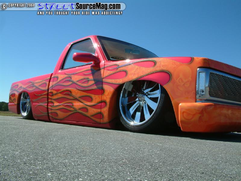 four RS-72 Slam Specialty bags, 8 nickel plated GC Valves, 2 VIAIR 450’s filling the air tank which would be the frame holding up to 7 gallons. Stainless steel airline would then be ran throughout. Not yet finished they would then build a custom cross-member for the air ride housing an “SNC” flush molded with an orange lens and then striped in HOK lime green as well as the logo being a light. With the suspension in place the S10 would now tuck the 20x8.5 Chrome Boyd Coddington Turbines with 245/35R20 Nitto tires.