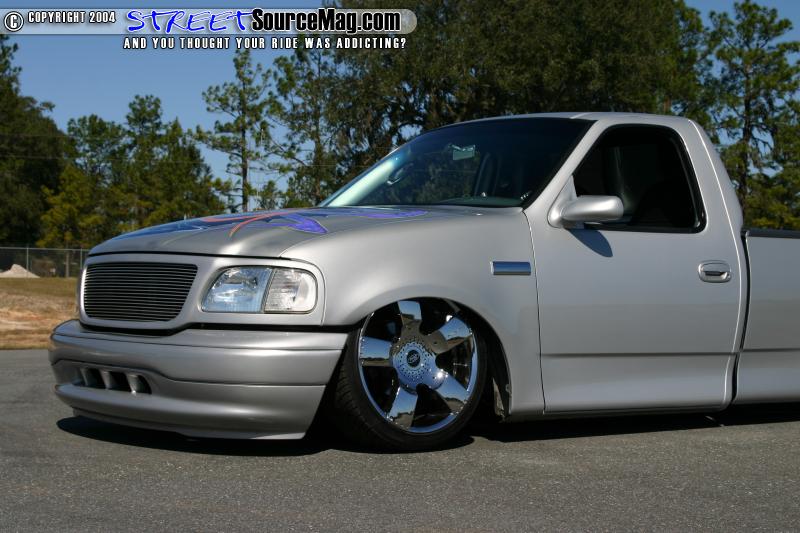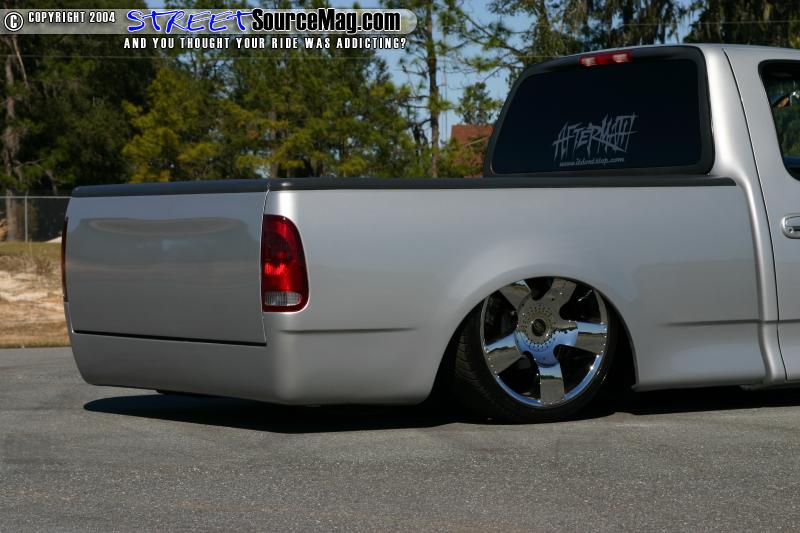 Matt’s F150 rolls on a notched frame by Bulletproof Fabrication and air bags on all four corners, and features nitro drop shocks, notched firewall, and a 6 link canti setup by KD Components. Matt’s truck airs up courtesy of an engine driven compressor. The battery was relocated under the bed and the stock gas tank was sectioned to fit. Matt’s truck tucks the massive 22” KMC Thunders.