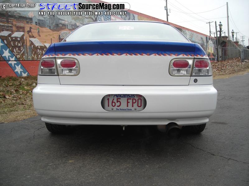 After several days of prep work by Tim and his partner, Steve Rogers was brought in to spray the Pontiac G6 blue and Honda white two-tone paint. Tim then broke up the colors by adding orange tribal graphics between the colors. Once all the paint and buff work was done, the exterior was finished with a sunroof, cat-eye style headlights and altezza taillights.