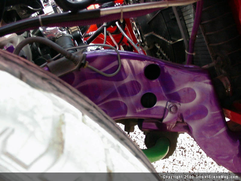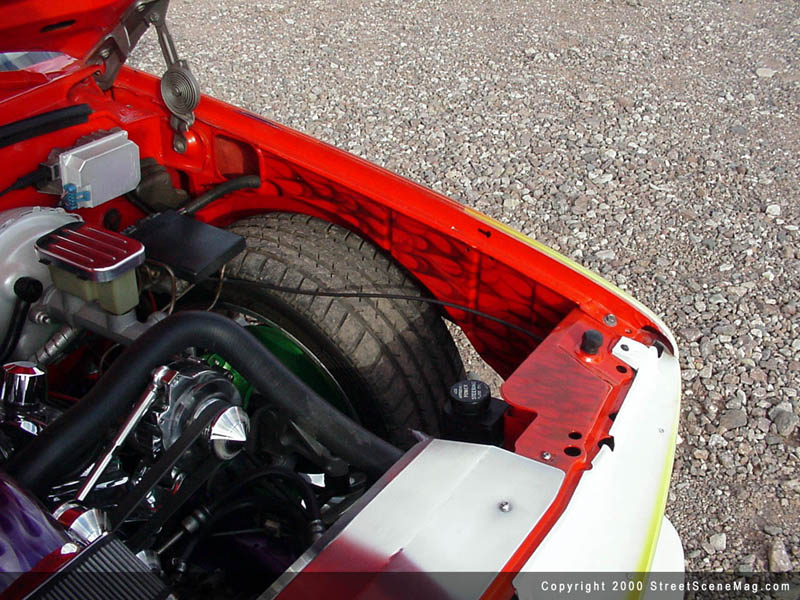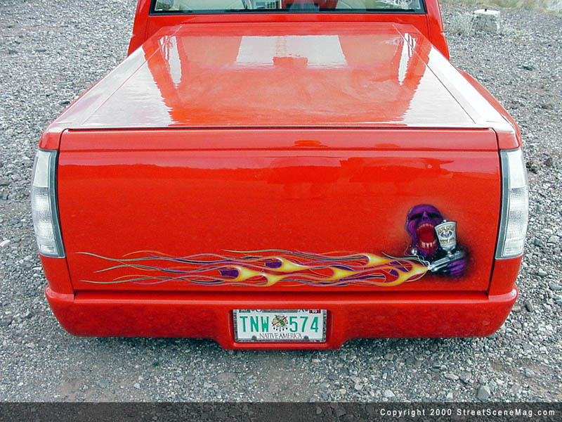 The crew from Carefree then laid a Kandy Tangerine by House of Kolor, over the entire truck. Next, they added the triple flames using white, yellow, orange, two different reds and purples, all from House of Kolor. The pinstriping was done with green, purple and blue applied by Wizard. Other notable exterior accessories include the Trenz grille insert and clear tails. In order to roll around to the shows and keep the engine looking as good as the rest of the truck, Jeff applied a few upgrades. A new water pump, alternator, pullies, valve cover, injectors, air cleaner and intake system all by Street & Performance were installed. Lots of chrome plating and polishing fill the engine bay while everything else is painted with flames and skulls visible throughout. A Boag exhaust system was also added to beef up the performance and sound of Jeff's V8.