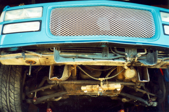 Next is the shot of the truck with the frame horns & bumper removed in one piece. To keep the frame horns from hitting the ground when the truck is laid down, the bottom of the horns get cut down even with the radiator support mounts. The bottom is cut off & a piece of 3/16 plate is cut to box the frame back in. After the welds cool, the bumper with horns attached is positioned back on the truck, 3 1/2" lower than stock & welded in place. By doing the frame horns first, the body has something to be lowered down onto, to keep it supported.