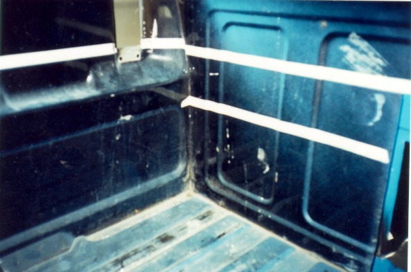 Here is a shot of the outside, finished & undercoated. All that's left on th cab is the re-installation of the interior. After the cab, it's on to the bed. here are the tape lines for the section to be removed.