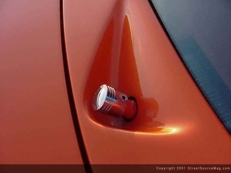 Not only was a Cadillac front clip installed, it was also completely molded together, for a true one-off look. With the new custom molded bumper, grille, hood and headlights, the new overall look that Wendy strived for was beginning to take place. The custom front bumper also was equipped with a molded Trenz billet insert.  Moving on, the wiper cowl was smoothed and the door handles were shaved. Other shaved items include the antenna along with the roof rack. Up top, you will find a power sunroof, provided by American Sunroof Company of San Diego, California.