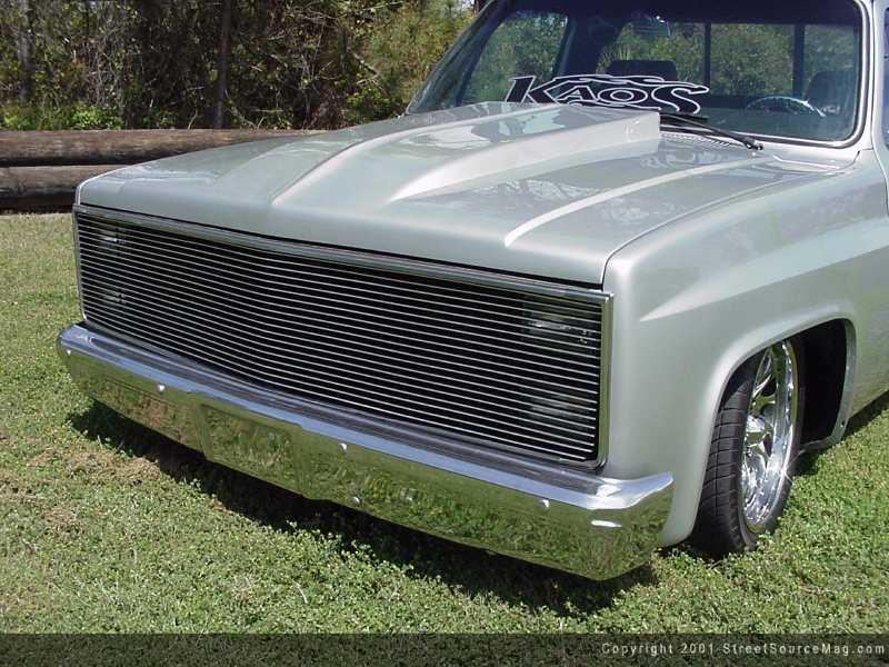 Finishing up the body mods came in the form of installing a fiberglass cowl hood and an East Coast Customs phantom grille. With the body finally mods finally coming to a close, Bradley allowed the crew at Competition Paint &Body to complete the exterior of his truck by adding a special paint scheme. First, Competition sprayed Sebring Silver Metallic over every inch of Bradley's Chevy. Before anyone could even be happy about the new-found color, Competition went back and laid down the blue and green ghost flames that run from the front of Bradley's Chevy, past the doors. The crew at Competition sprayed the Chevy with many, many coats of clear, giving Bradley's truck the desired shine he was striving for.