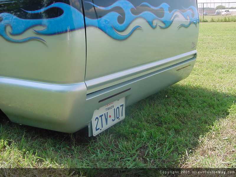 The front of the truck was coming along nicely, but something in Chris's mind told him that he needed something more to help the front-end get that "mean" look he was striving for. With that in mind, Chris covered the tacky stock bumper with a Street Scene bumper cover, complete with pilot fog lights. Now that the front-end looked clean as hell, it was time to take care of the rear-end. With help of Sean at Phat Rides, Chris cleaned up the rear of his S-10 by molding in a custom rollpan with LEDs and shaving the boring factory taillights and tailgate handle. Soon after the bodywork was complete, it was time for Chris to add some paint to his slick S-10. Needless to say, Chris wanted something that no one had ever seen before, so he handed the truck over to Max Maxwell of Maxed Out Paintwurx, Before he let Max unleash his skills of design, Chris gave his wife a chance to come up with a concept that they both would enjoy. She came up with a great idea, using tribal flames as the main concept.