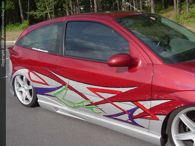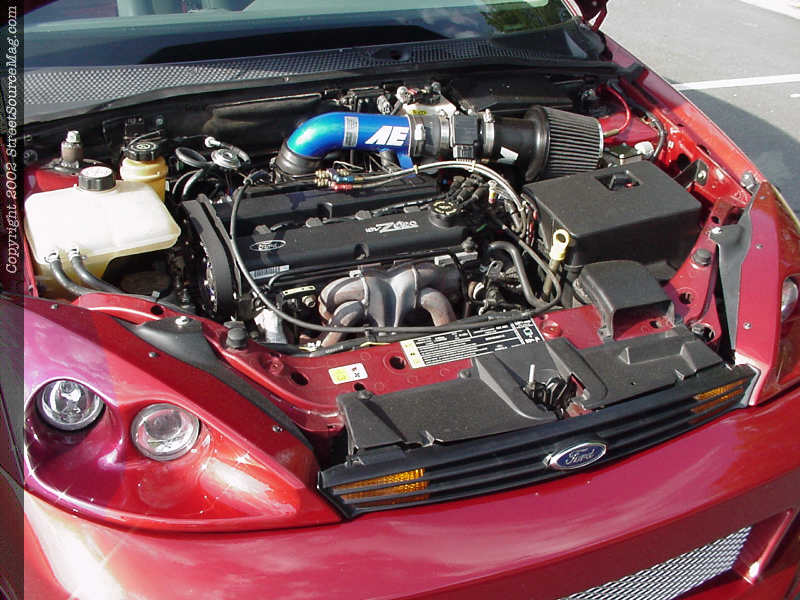 Under the hood of Howard's Focus, many things were changed to give the little four-banger much more power than stock. First, Howard ported and polished the heads of the stock engine, and replaced the internals with stronger units such as Crowler rods, JE Pistons and a new camshaft courtesy of Web cams. Howard replaced the stock underdrive pulley with a model from Esslinger and added a Ford Motosports intake manifold, as well as AEM intake. If the new mod's weren't enough, Howard also installed a 150 shot direct port nitrous system from NOS and then used a Diablo Sport Chip to allow the car's computer to utilize the new engine modifications to the max. In the rear, Howard's Focus can breathe easier thanks to 2 1/2" Borla cat-back exhaust system.